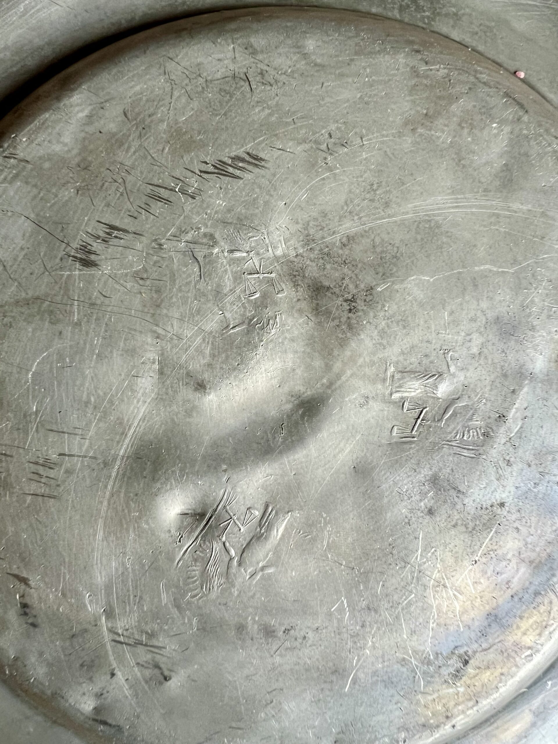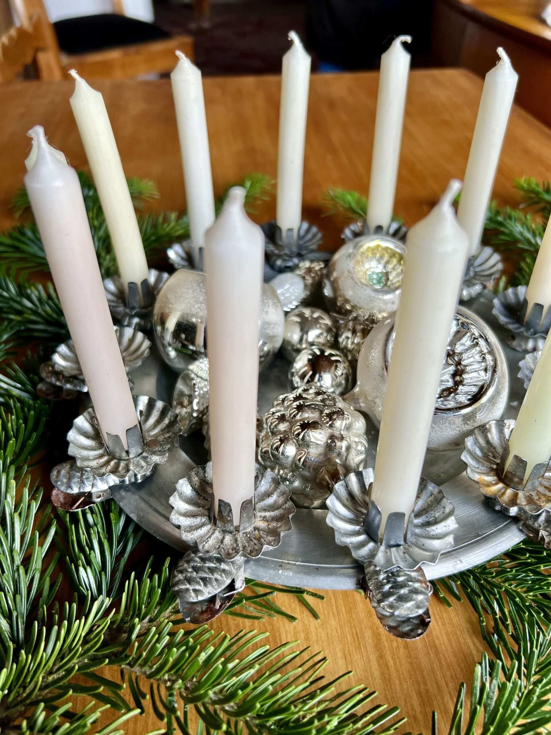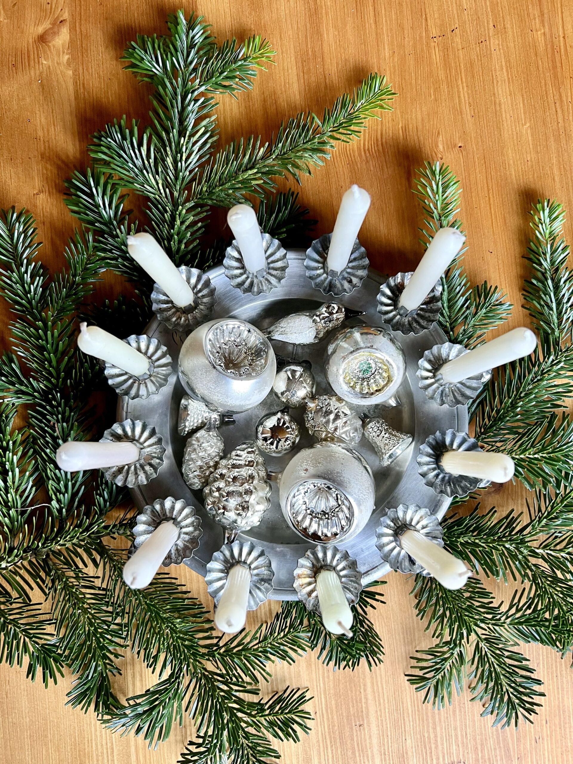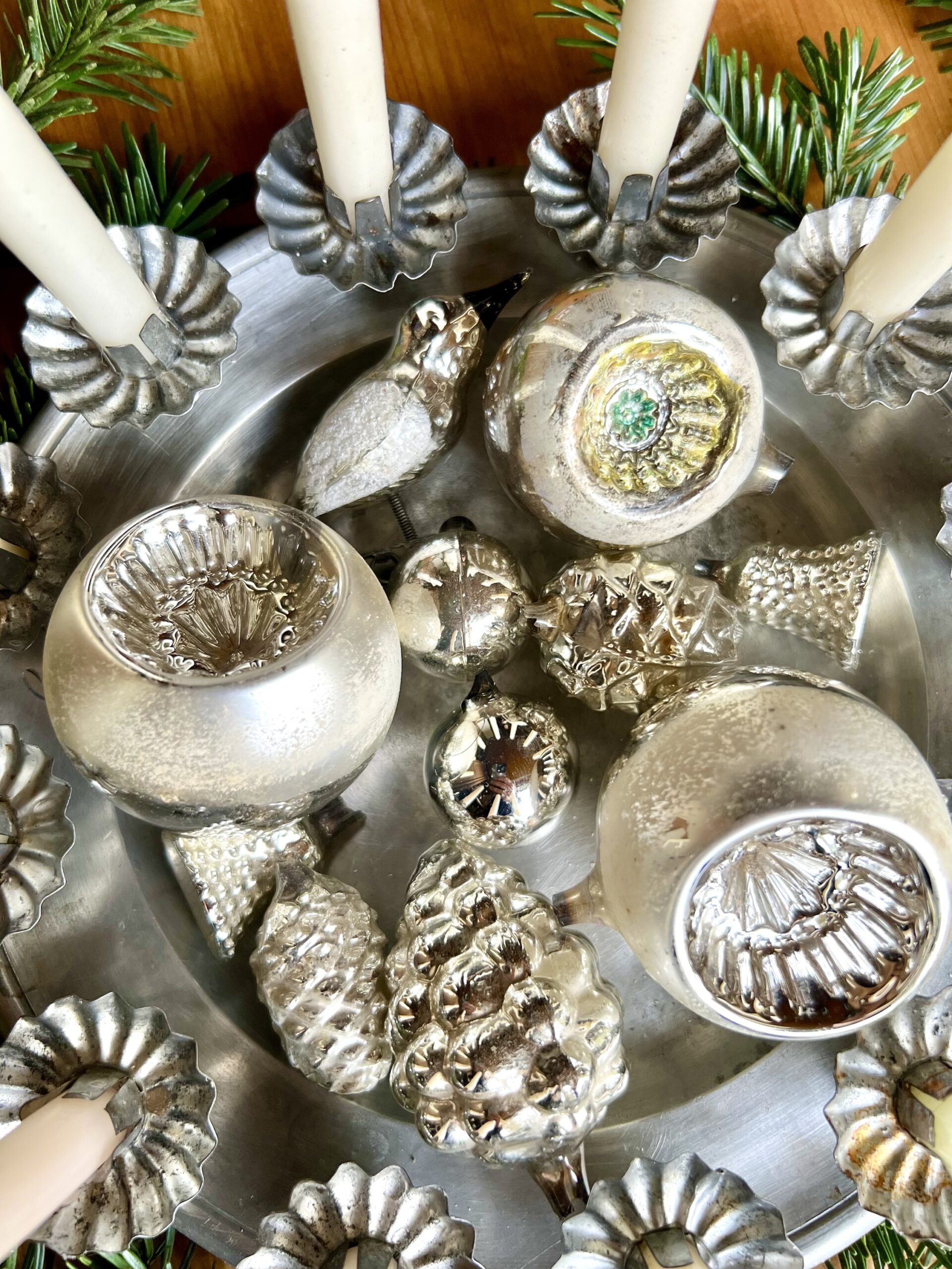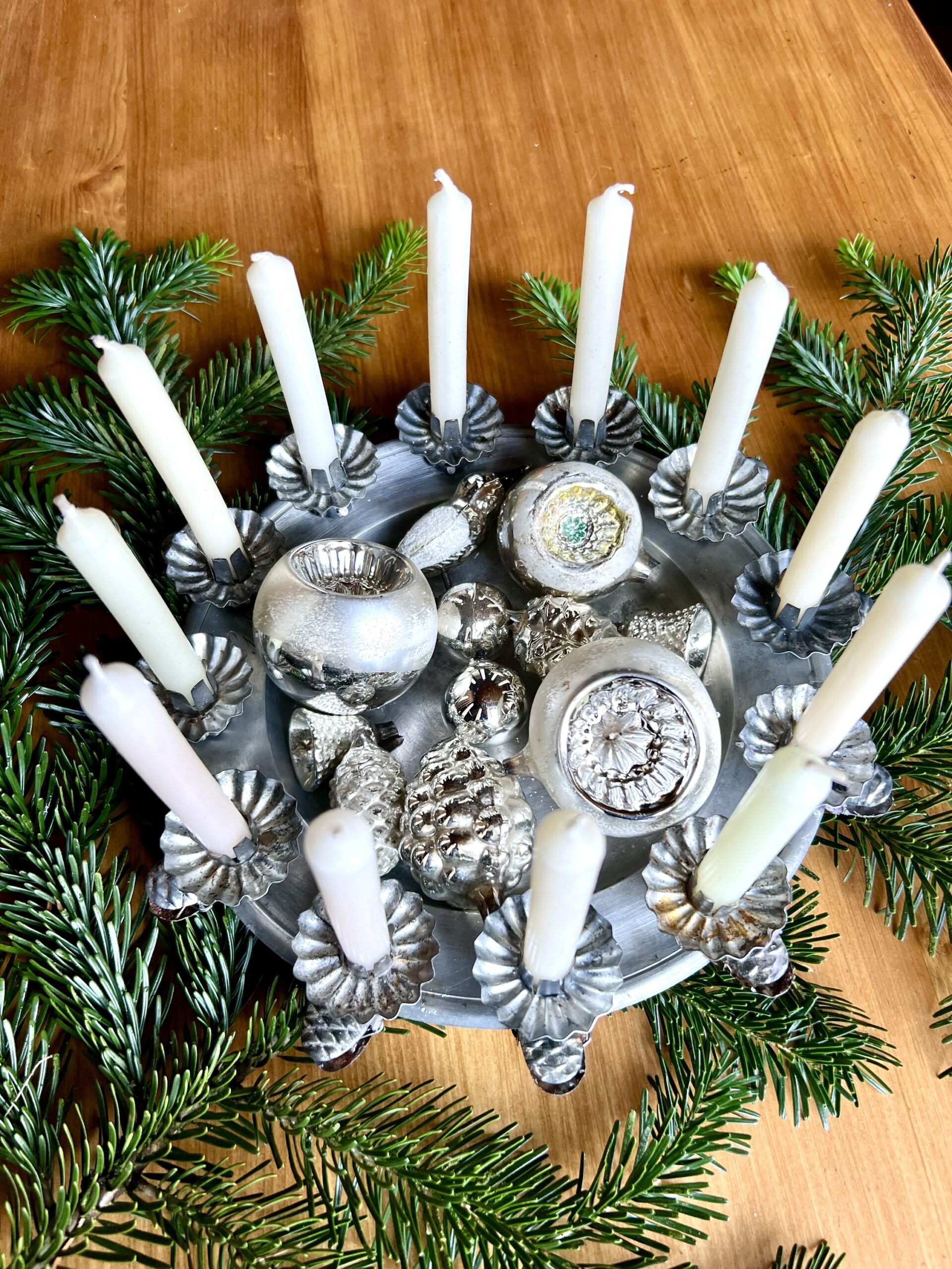 Antiker Zinnteller vor 1900 gefertigt, Durchmesser ca. 22,5cm, weihnachtlich dekoriert mit Kugeln und Kerzenhaltern aus der ersten Hälfte des letzten Jahrhunderts.